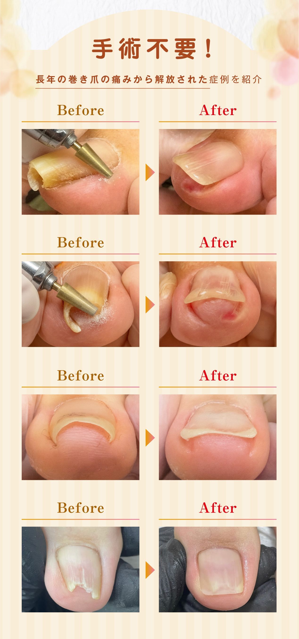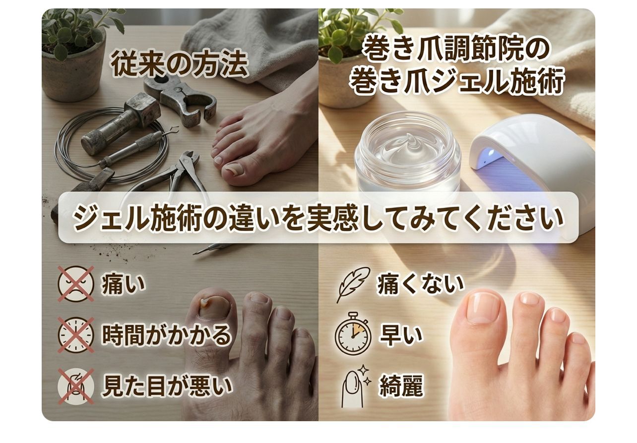 巻き爪調節院では、「切らない・痛くない」独自のジェル施術で、あなたの爪を本来の形へ導きます。